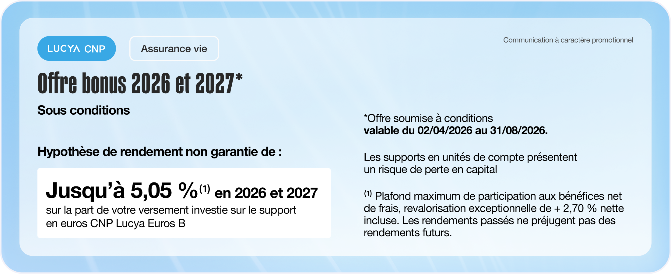 Profitez d’une revalorisation exceptionnelle pour tout versement initial ou libre, d’un montant minimum de 5 000 €, entre le 02/04/2026 et le 31/08/2026(1), sous réserve d’un taux d’unités de compte minimum sur le versement et du maintien de ce taux durant la période(2). Offre limitée : l’enveloppe étant limitée, elle peut être clôturée à tout moment.