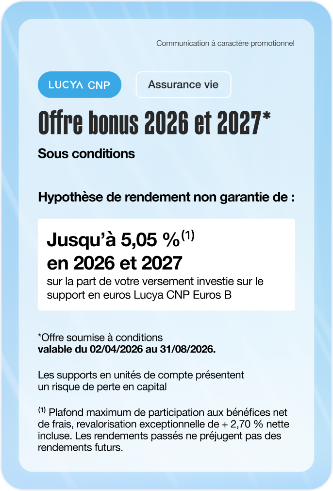 - Cette offre n’est valable que pour les nouveaux versements. Le versement n’est pas éligible si le souscripteur a effectué, après le 1er janvier 2026, un rachat sur tout contrat d’assurance vie ou de capitalisation souscrit chez CNP Assurances.