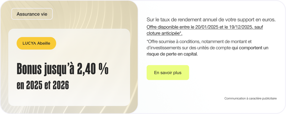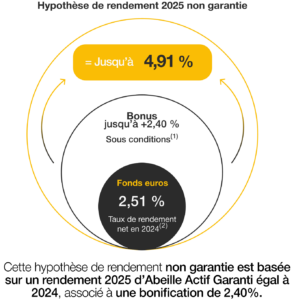 L’option Bonus 2026 +2,40% et l’option Bonus 2026 +2% ouvrent, sous conditions, respectivement droit à l’ajout d’un complément de rémunération de 2,40% ou de 2% au taux de rendement du support en euros Abeille Actif Garanti au titre du contrat pour l’année 2025 et / ou 2026, pour les sommes investies sur ce support dans le cadre de l’opération. Le taux de rendement s’entend net de frais de gestion, hors prélèvements sociaux et fiscaux en vigueur.