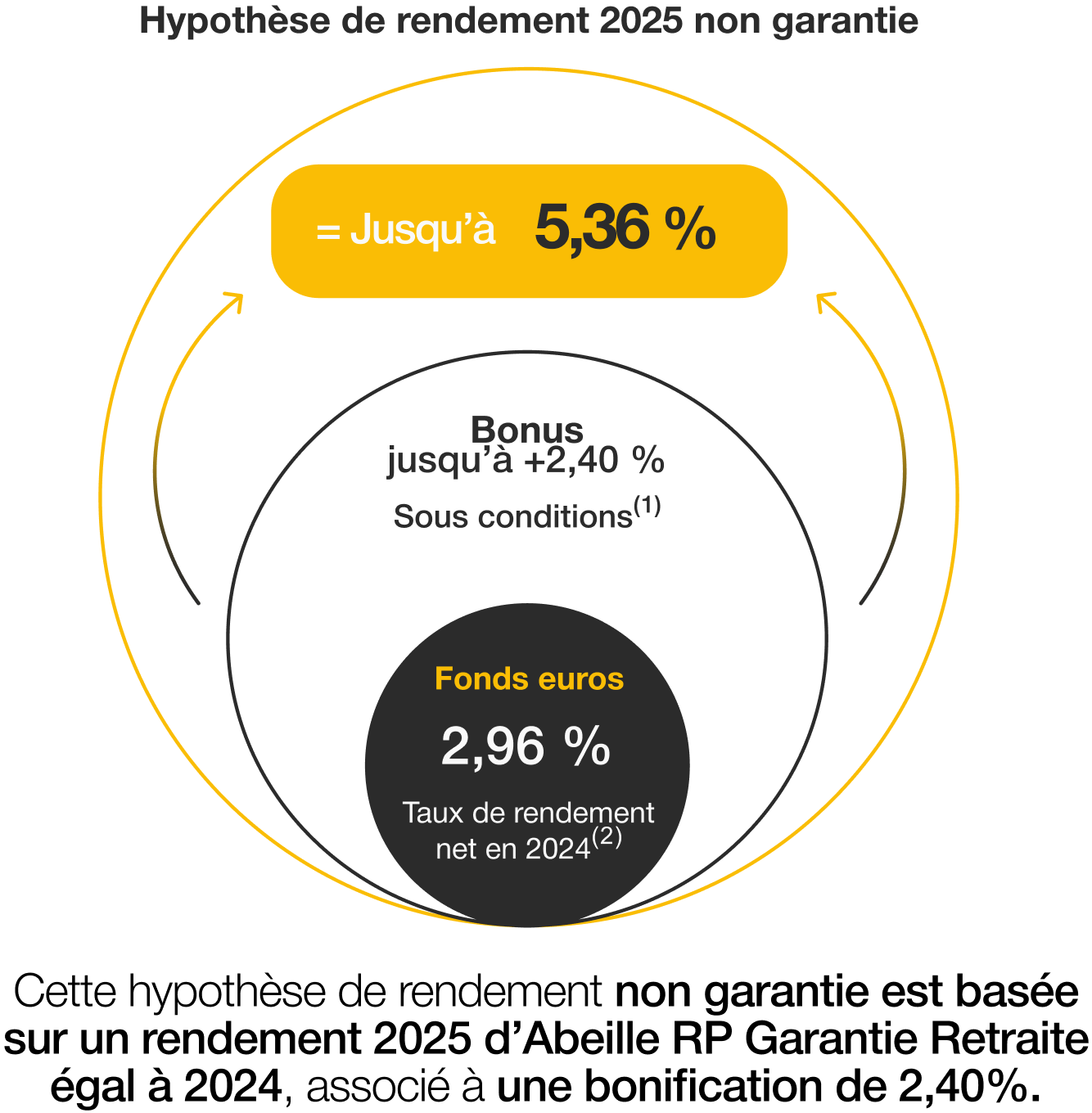 L’option Bonus 2026 +2,40 % et l’option Bonus 2026 +2 % ouvrent, sous conditions, respectivement droit à l’ajout d’un complément de rémunération de 2,40 %, ou de 2 % au taux de rendement du support en euros Abeille RP Garantie Retraite au titre du contrat pour l’année 2025 et / ou 2026, pour les sommes investies sur ce support dans le cadre de l’opération. Le taux de rendement s’entend net de frais de gestion, hors prélèvements sociaux et fiscaux en vigueur.