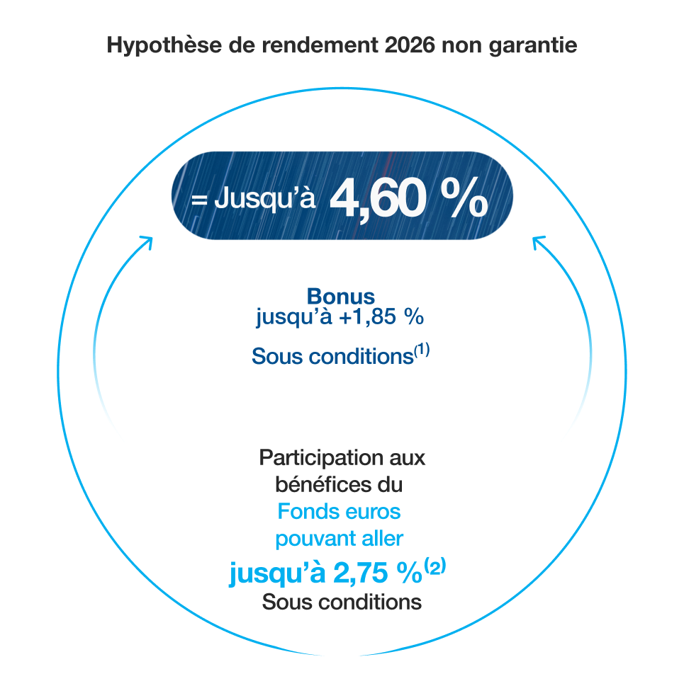 – à un taux égal au taux de participation aux bénéfices définitif du support en euros de votre Contrat(5) du 31/12/2026 pour l’exercice 2026 et du 31/12/2027 pour l’exercice 2027 majoré du bonus de +1,85%(4).