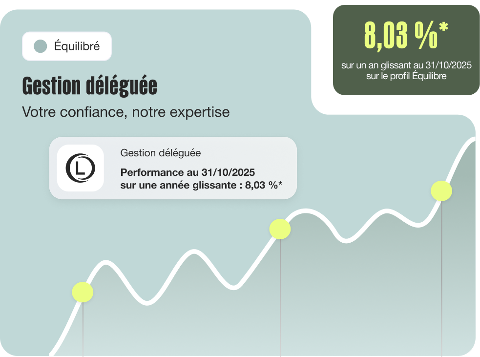 * Performance sur un an glissant (du 01/11/2024 au 30/10/2025) du profil équilibré de la gestion déléguée, conseillée par Lucya, sur le contrat Lucya Cardif. Performance depuis l’origine (de 06/2023 au 30/09/2025) : 21,98%. Les performances passées ne préjugent pas des performances futures, et peuvent évoluer à la hausse comme à la baisse. La performance présentée est brute de frais de gestion du contrat.