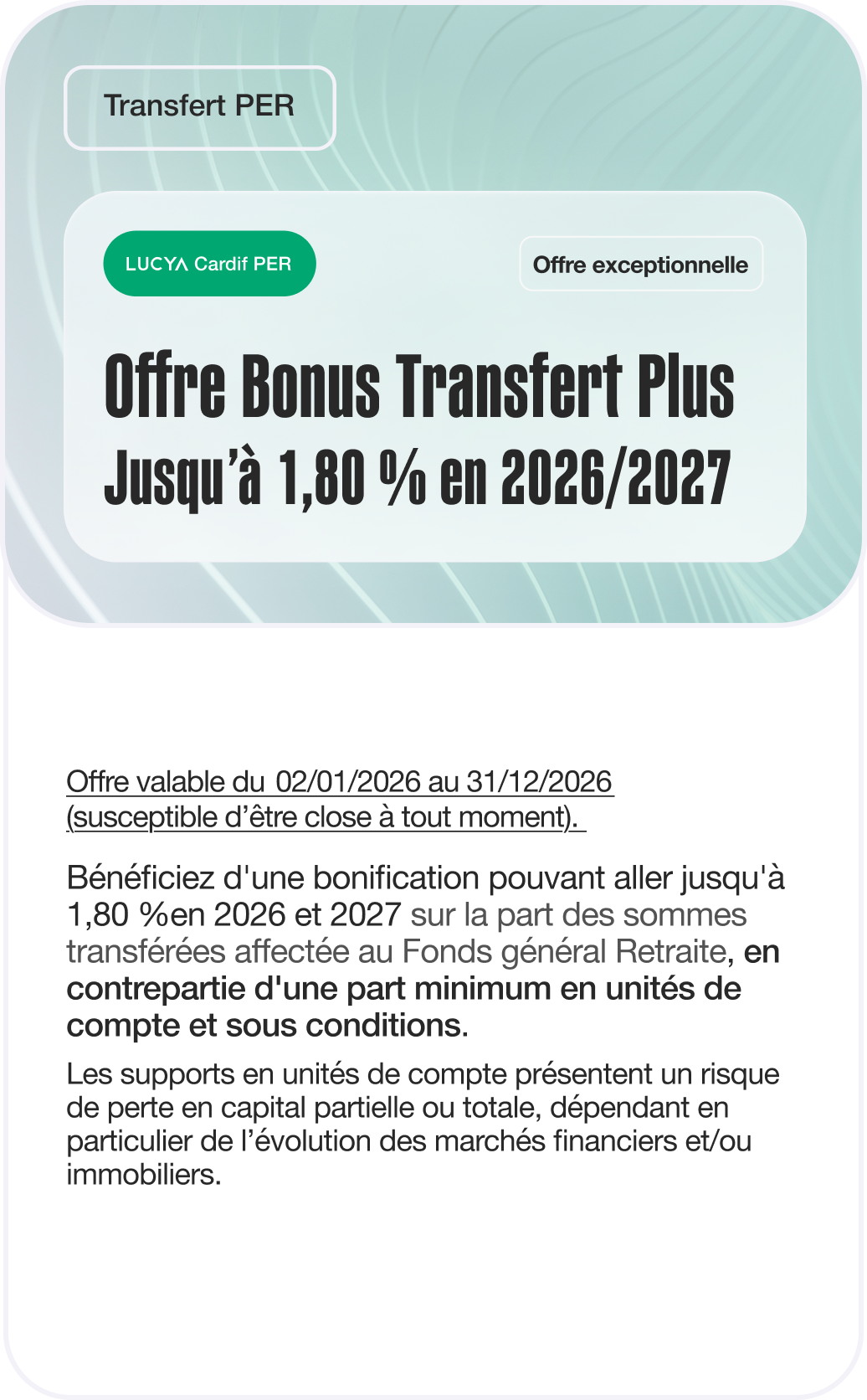Au 31/12/2026, et uniquement à cette date, la part des sommes transférées affectée au Fonds général Retraite Bonus dans le cadre de l’Offre Transfert Plus Lucya Cardif PER 2026/2027, bénéficiera, sous respect des conditions, d’une valorisation annuelle au taux de rendement, net de frais de gestion, du Fonds général Retraite du contrat majoré de 80 % de ce même taux et dans la limite d’une contribution supplémentaire au taux de rendement net de 1,80 %.