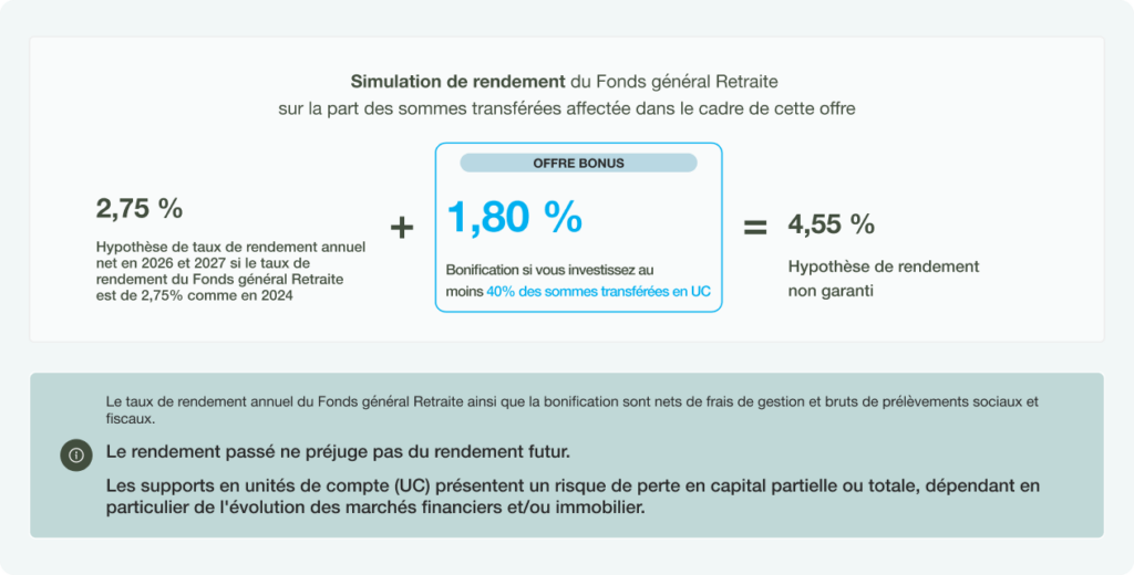 La valorisation au taux de rendement du Fonds général Retraite du contrat, net de frais de gestion et la contribution supplémentaire sont calculées prorata temporis de la date d’effet du transfert jusqu’au 31/12/2026.