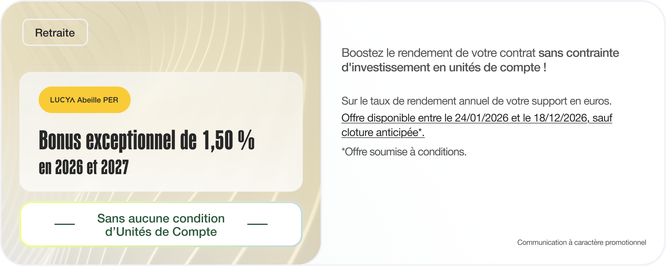 * Taux de rendement du support en euros Abeille RP Garantie Retraite, net de frais de gestion annuels du contrat Lucya Abeille PER qui s’élèvent à 0,60%, brut de prélèvements sociaux et fiscaux dus selon la législation en vigueur.